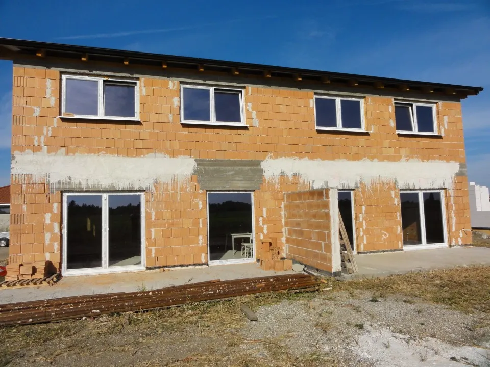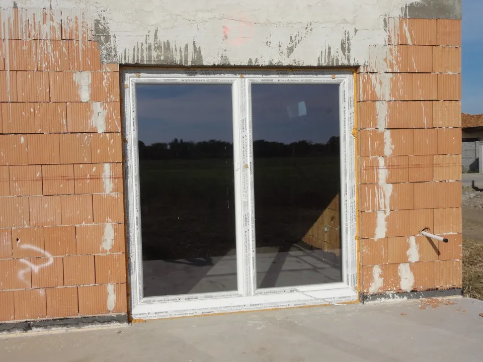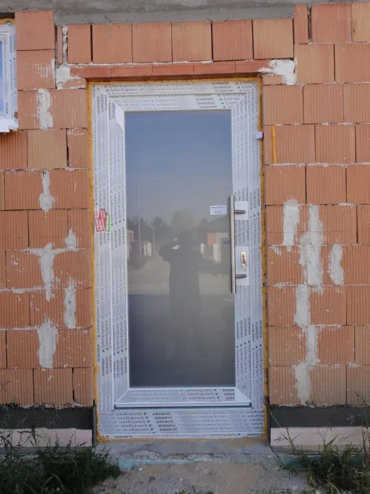 Montáž plastových okien triedy SILVER v bielej farbe. Použité zasklenie izolačným dvojsklom. Vchodové dvere tiež z plastového profilu s elegantným zasklením mliečnym sklom a nerezovým madlom.